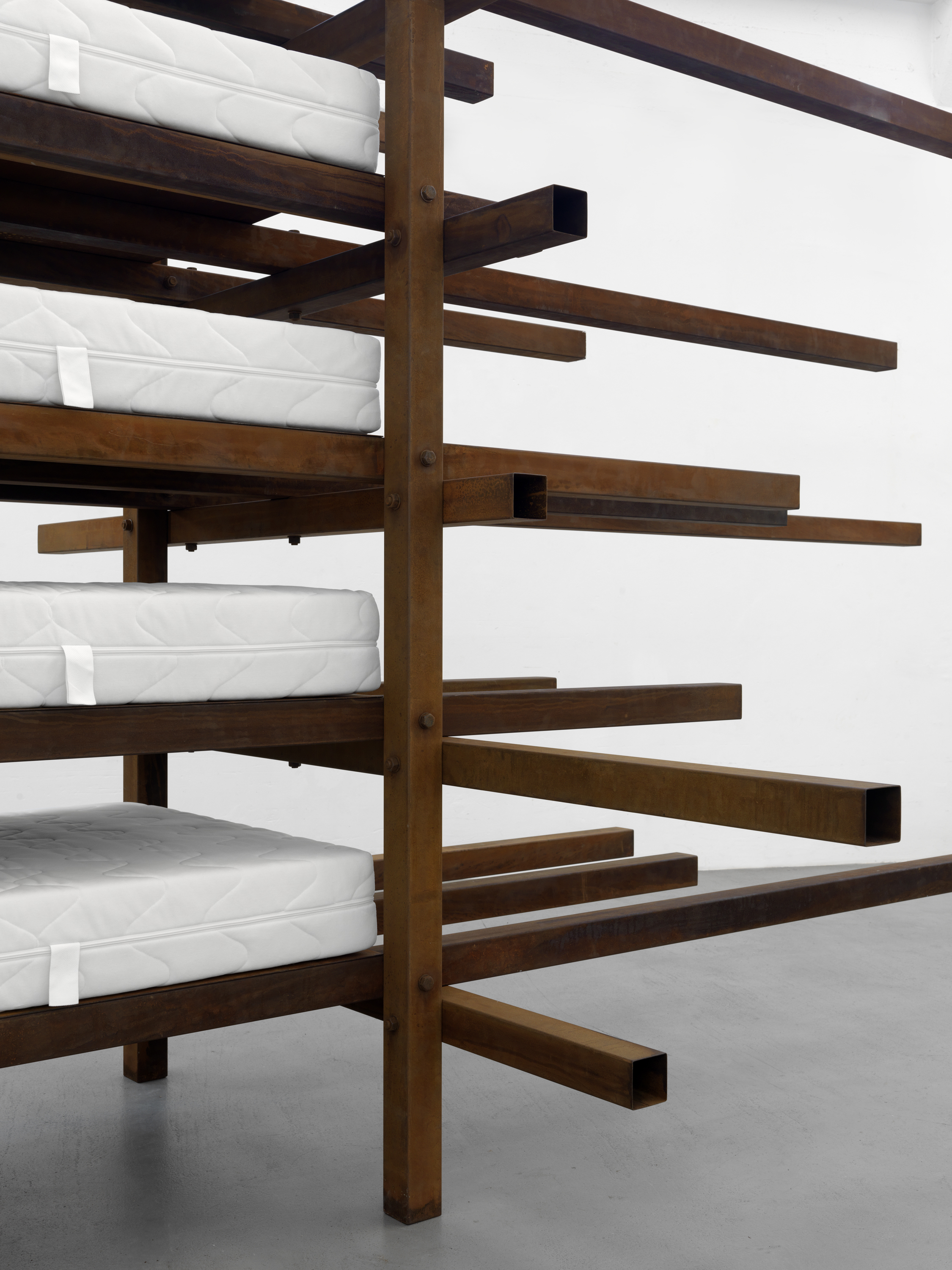 Hostal (Raum II, freistehende Version), 2016 Stahl, Matratzen 310 x 411 x 777 cm
