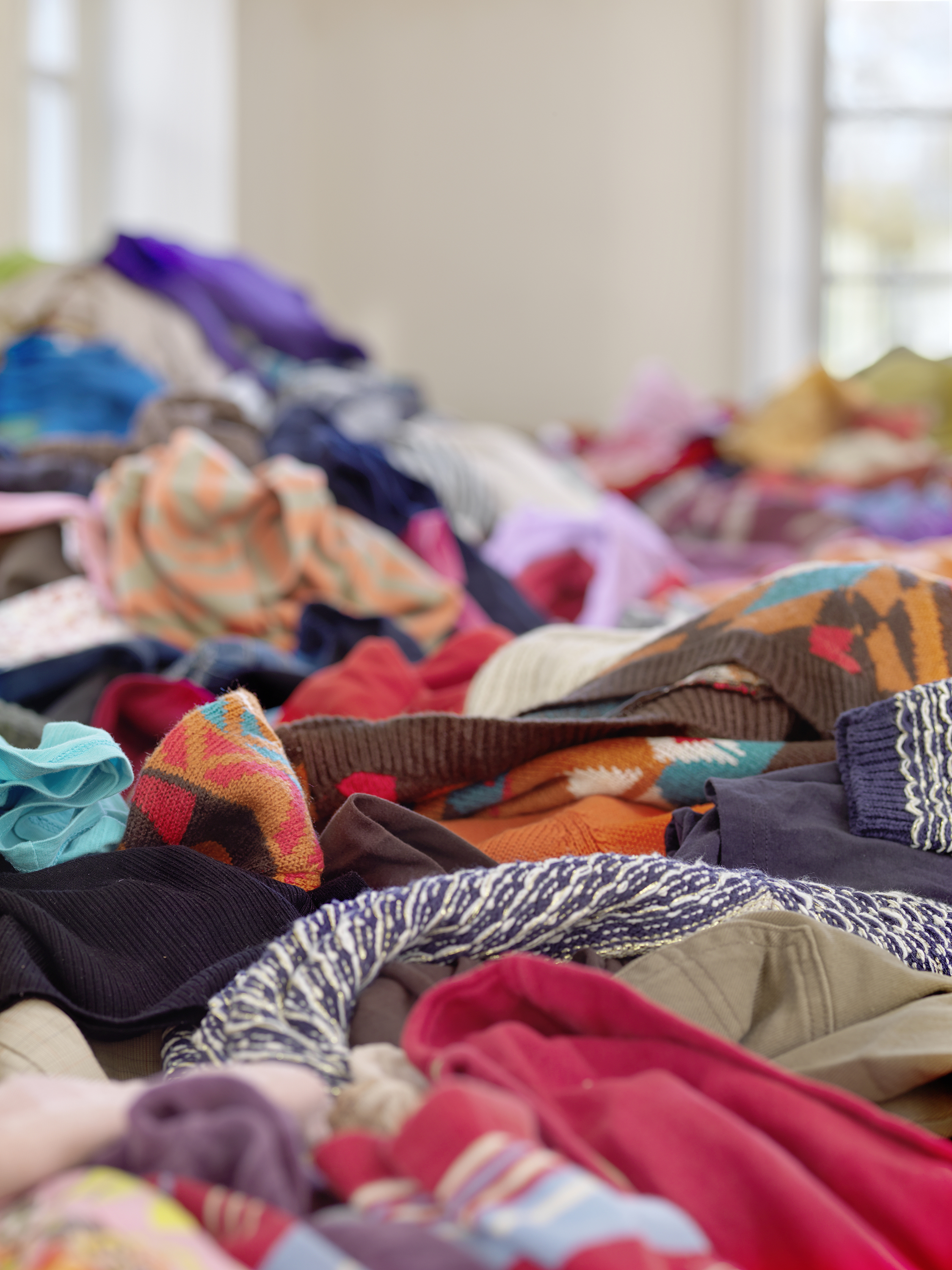 Shady Place II, 2019 Rippenstreckmetall, Kleidungsstücke ca. 145 x 1230 x 900 cm