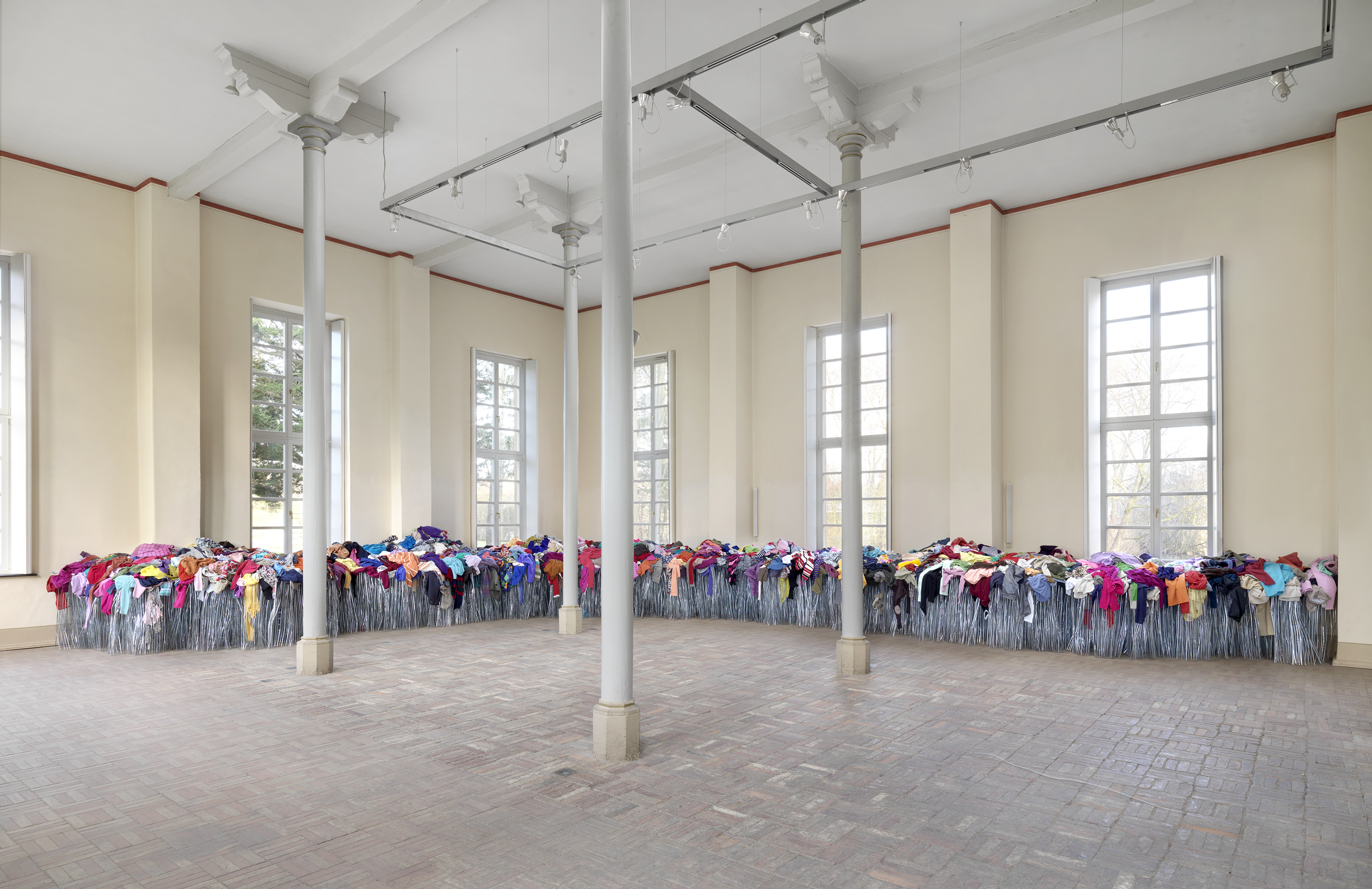 Shady Place II, 2019 Rippenstreckmetall, Kleidungsstücke ca. 145 x 1230 x 900 cm