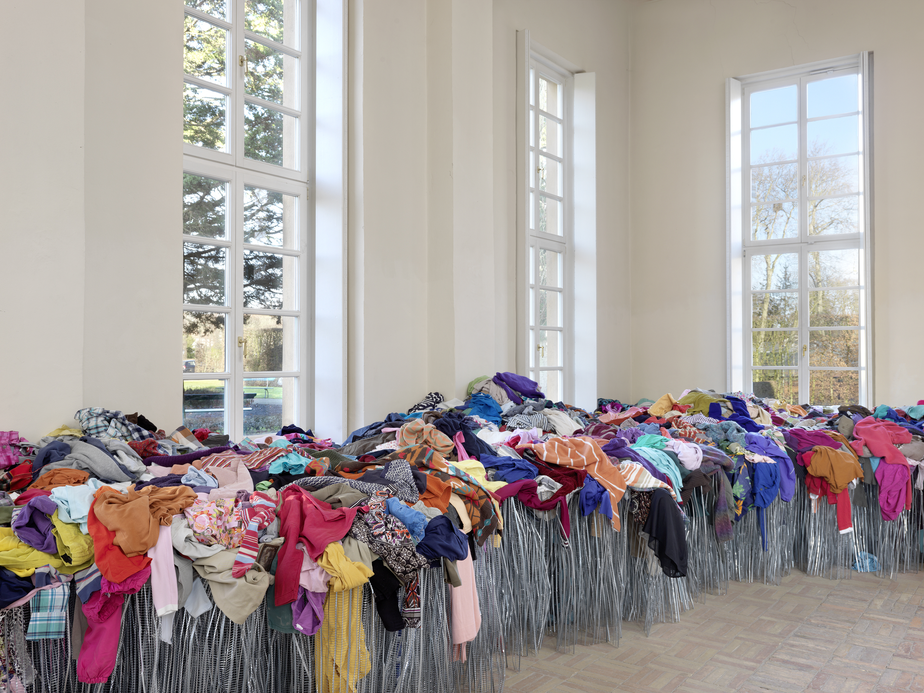 Shady Place II, 2019 Rippenstreckmetall, Kleidungsstücke ca. 145 x 1230 x 900 cm