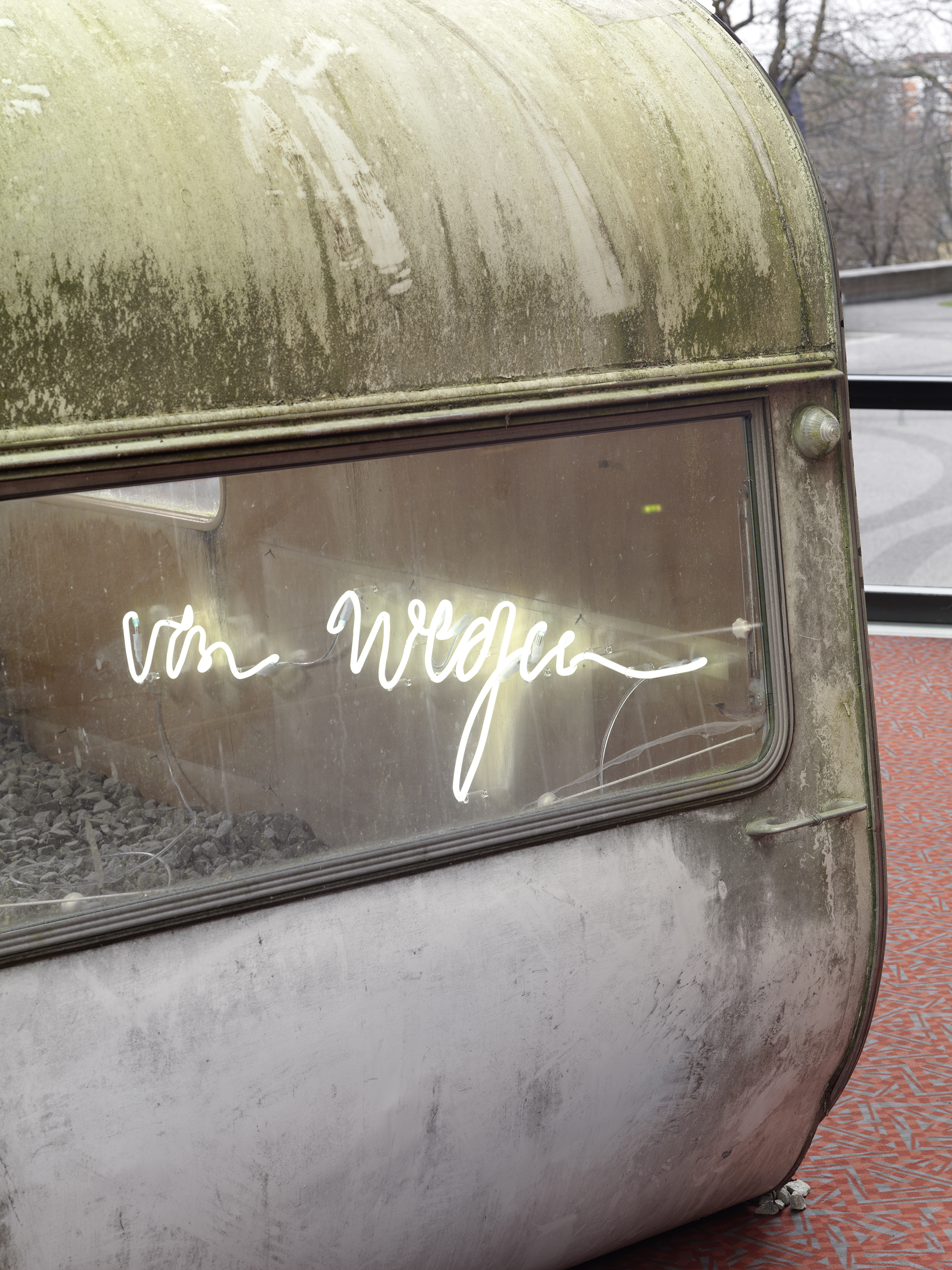 von wegen, 2020 Wohnwagengehäuse, Schotter, Neonschrift ca. 196 x 330 x 280 cm