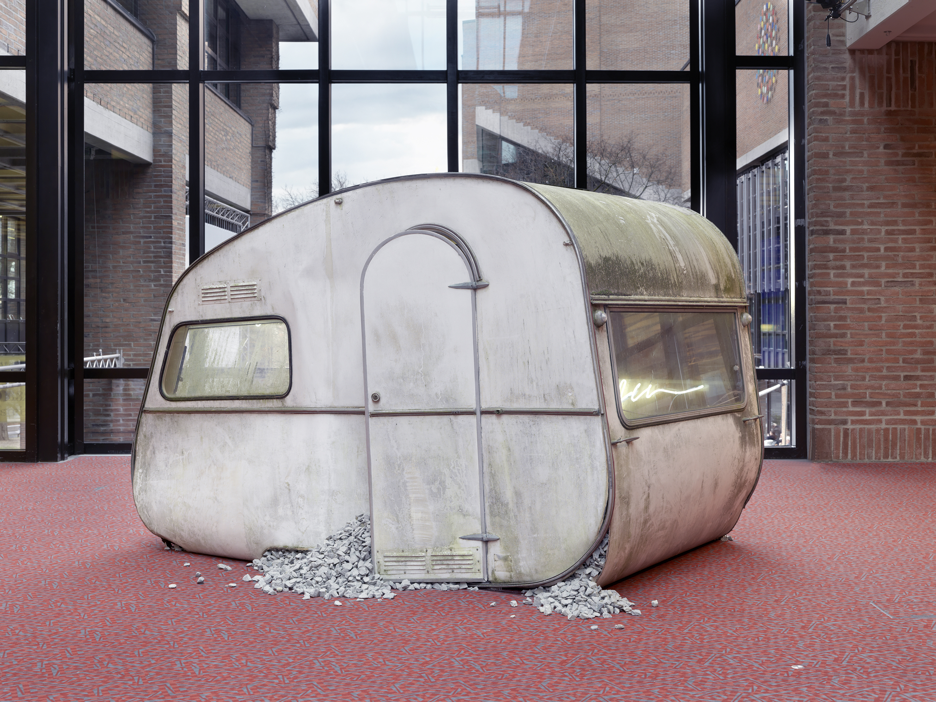 von wegen, 2020 Wohnwagengehäuse, Schotter, Neonschrift ca. 196 x 330 x 280 cm