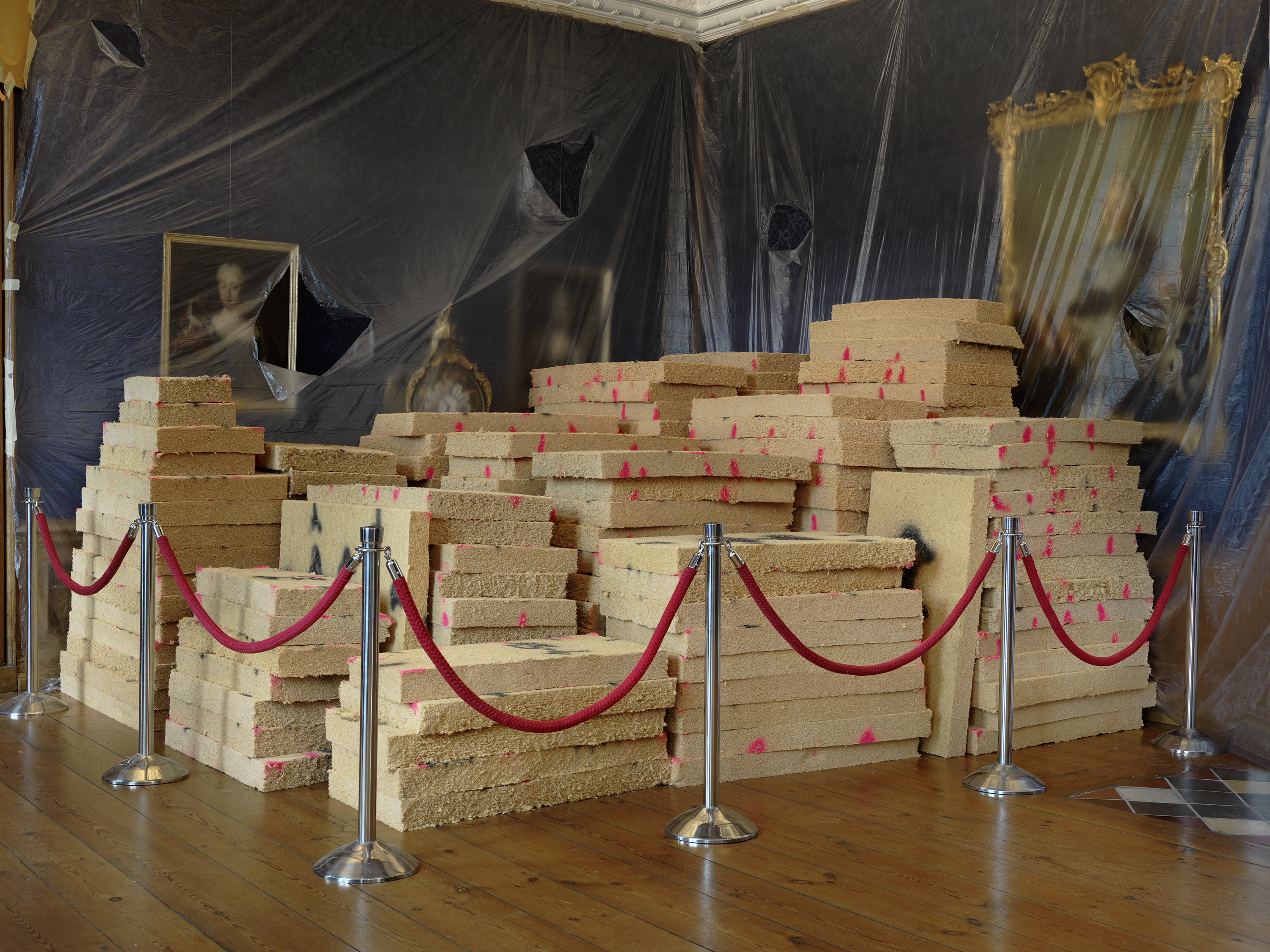untitled (Eutin version), 2019 wood fibre insulation boards, spray paint, plastic foil, paper, adhesive tape, metal stand, cord approx. 375 x 960 x 625 cm