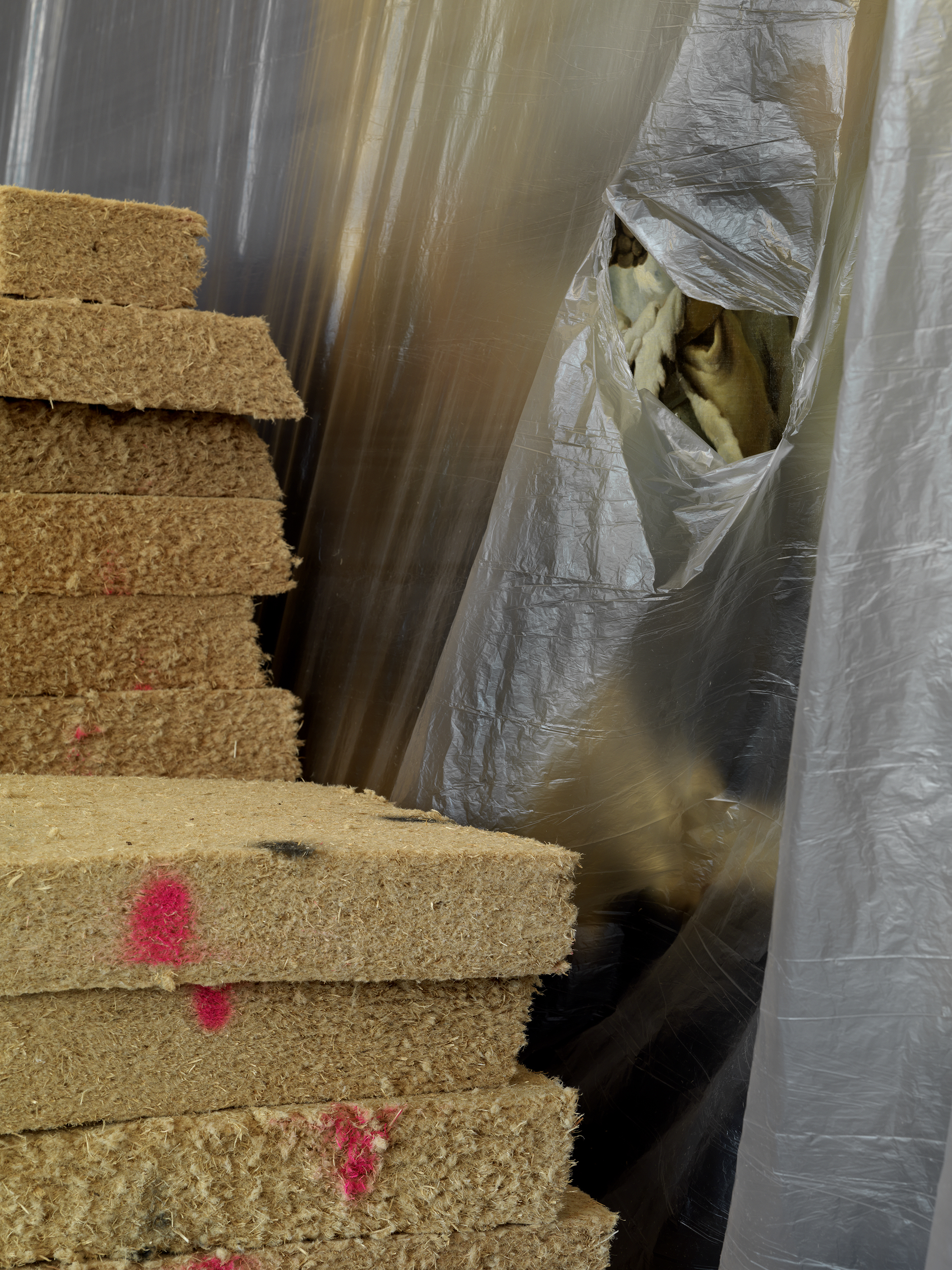 untitled (Eutin version), 2019 wood fibre insulation boards, spray paint, plastic foil, paper, adhesive tape, metal stand, cord approx. 375 x 960 x 625 cm