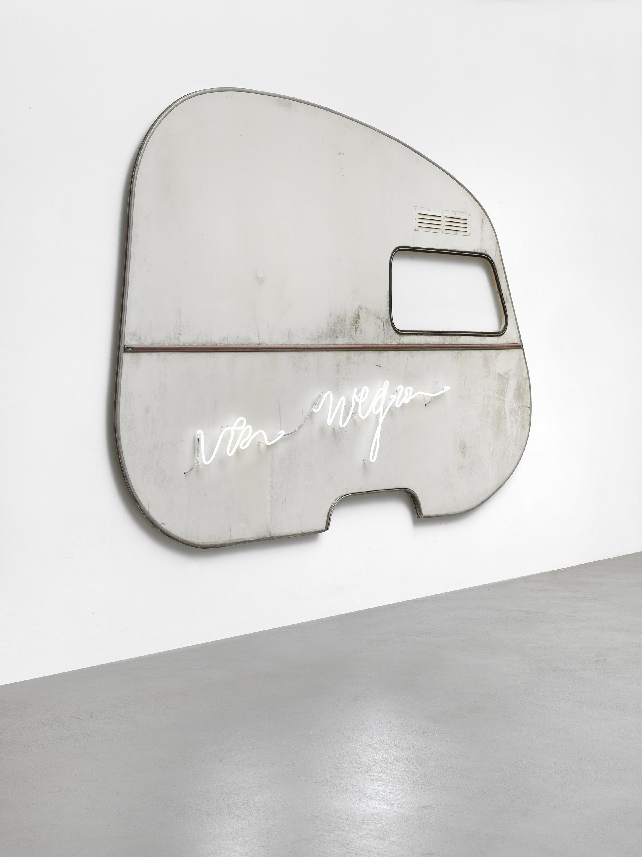 von wegen (wall piece), 2020 aluminium, acrylic glass, plastic, wood, neon letters 192 x 302 x 12 cm private collection